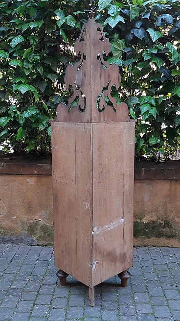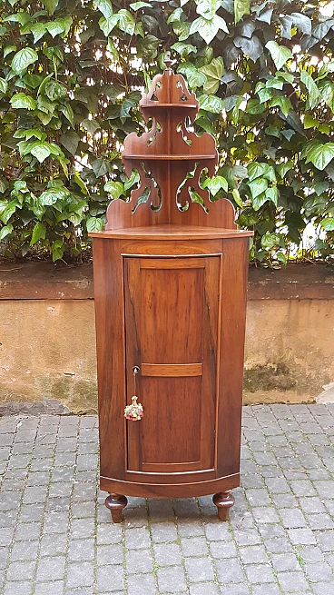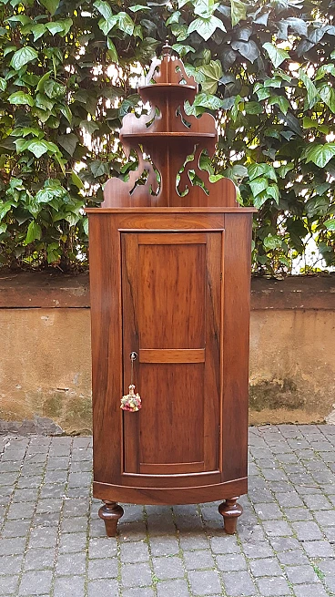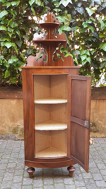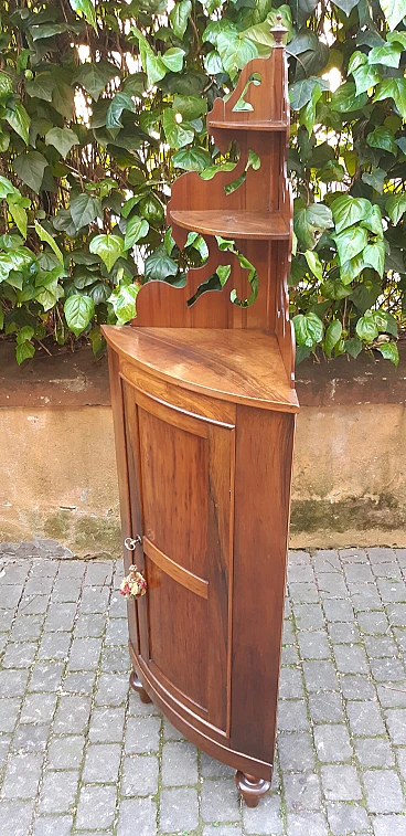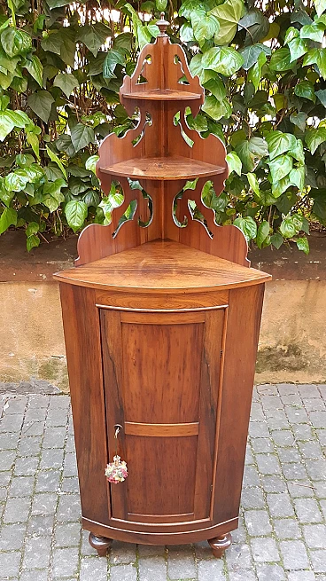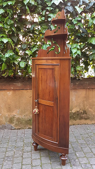 Emilian narrow column corner cabinet in walnut and cherry wood, 19th century. Refined small corner unit with a "rounded" front; walnut and cherry wood make it up from the feet to the refined perforated shelving, with a typical Emilian taste. Piece of furniture intact in all its parts. Wall side: 43 cm. Height to the support surface: 125 cm.