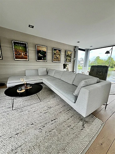 Beautiful B&B Charles corner sofa with chaise longue, made of light grey melange fabric. Spora Cat Super fabric. The sofa includes 4 rectangular back cushions and 2 square back cushions. The entire cover is removable and thus easy to clean. Very good state of preservation. Minimal signs of use. A few very slight, delicate marks, which do not imply. Beauty. Frame: steel and polished stainless steel die-cast aluminium. Dimensions: right sofa part: L 230 X W 95 X H 70 cm - left chaise longue part: L 225 X W 95 X H 70 cm. In addition to its beautiful design, the B&B Italia Charles sofa by Citterio has unprecedented seating comfort. Characteristic of the Charles collection by Antonio Citterio are the simple, almost classical lines of this elegantly designed furniture. Overall furniture measurements: width 325 cm, depth 225 cm, height 70 cm, seat height 40-42 cm. Price new 14,800 euro.