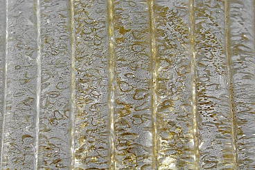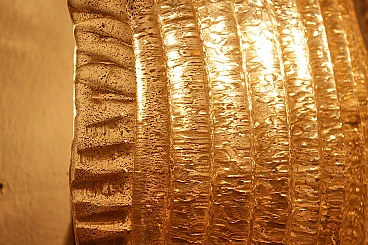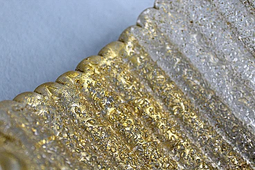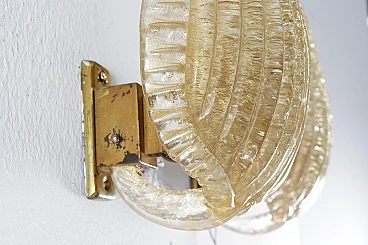 Pair of wall lights by Barovier & Toso, 1960s. Dew-effect glass shell lamps with vertical ribbing and gold casting, embellished with wavy side applied elements in relief. Stand and trim in gilt brass. Wear consistent with age and use.