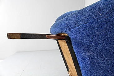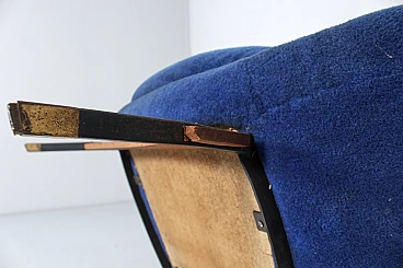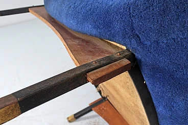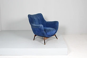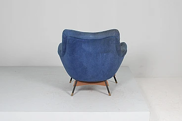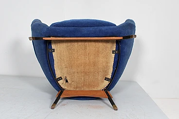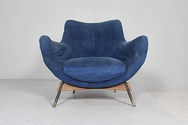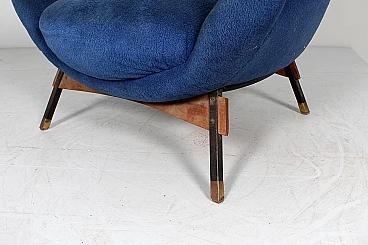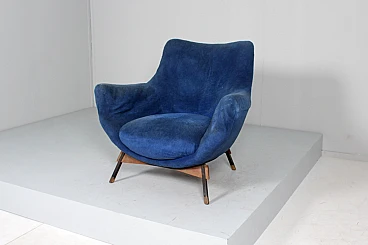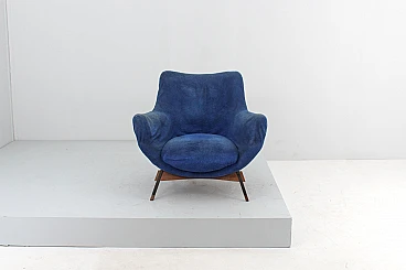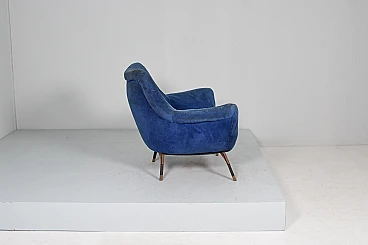 Armchair attributed to Guglielmo Veronesi for ISA Bergamo in the style of the Perla model, 1950s. Very elegant curved design furniture with metal and wood structure, blue velvet upholstery and inclined geometric feet in wood and brass. Wear consistent with age and use. Seat height: 40 cm.