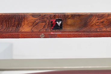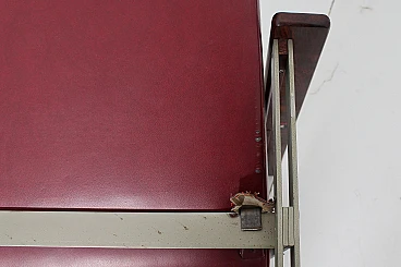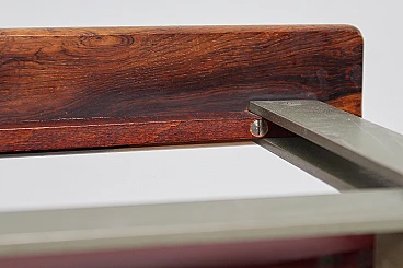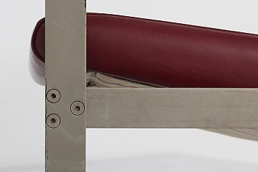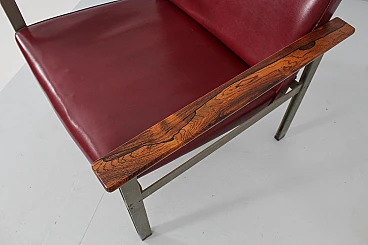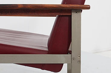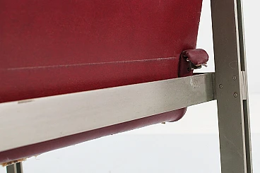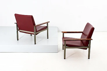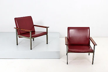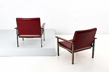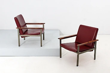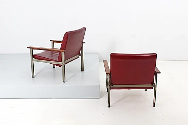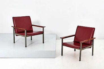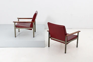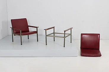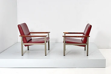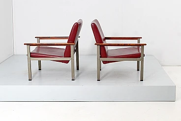 Pair of geometric armchairs in red skai, brushed metal with teak elements. Attributable to George Coslin for 3V Arredamenti Padova, 1970s. Presents factory label. Wear consistent with age and use.