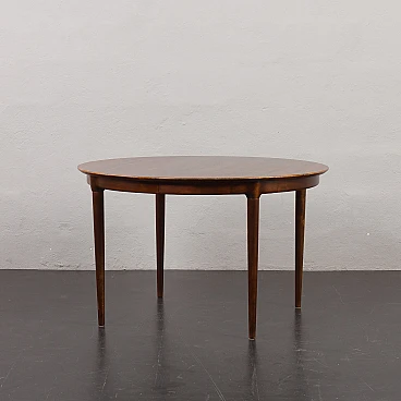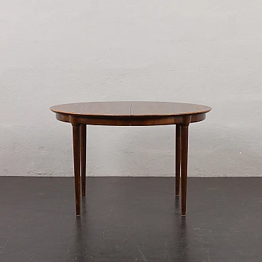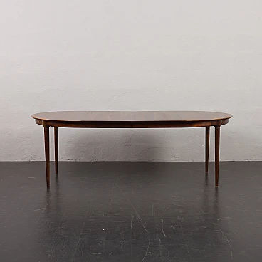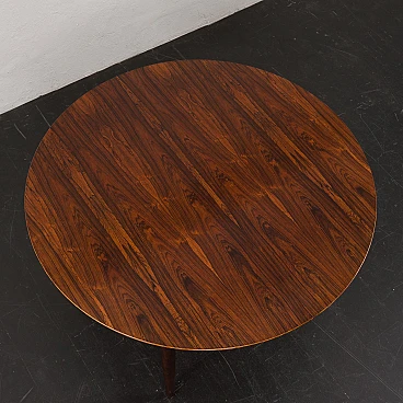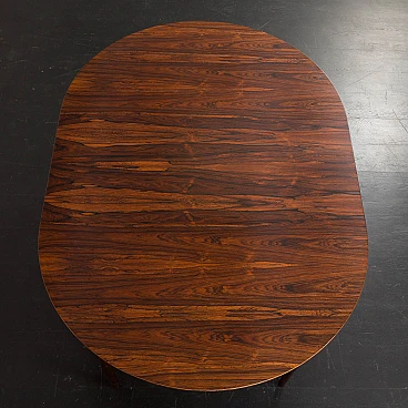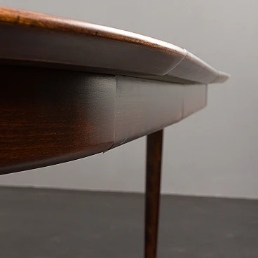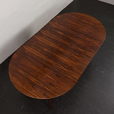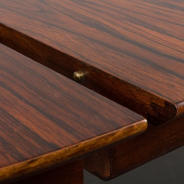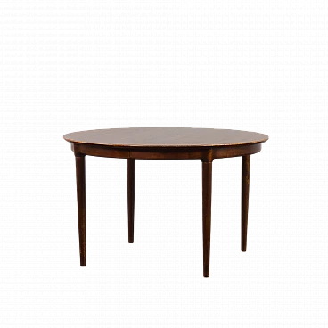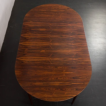 and functional design. This table is marked by its solid construction and includes two extendable leaves, making it versatile for different settings. The rich grain of the rosewood veneer gives the table an