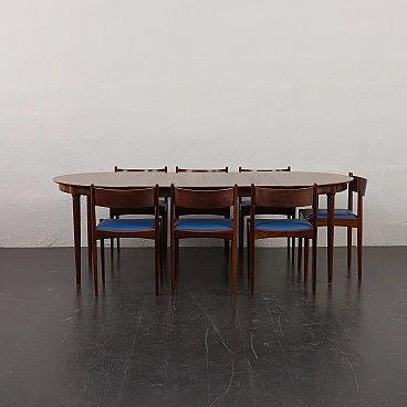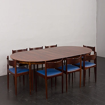 The unique design features reinforced profiled edges made from solid rosewood and extended leaves finished with aprons, which is quite rare. With the addition of tapered, detachable legs, the table not only reflects the mid-century modern aesthetic and the superior craftsmanship of Danish furniture makers but also the Scandinavian fondness for functionality.The table is in great fantastic original condition. The surface has been cleaned, and the lacquer has been polished and preserved with special compounds.