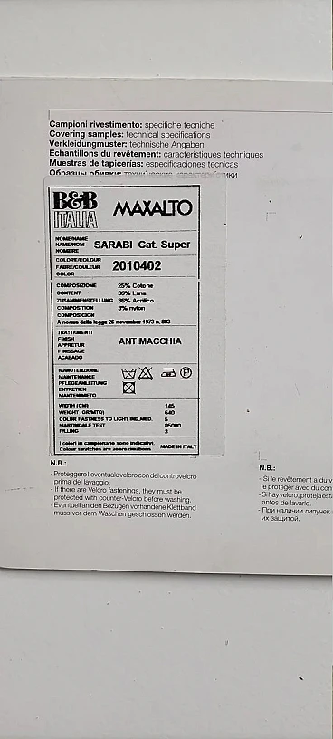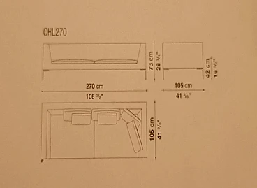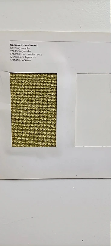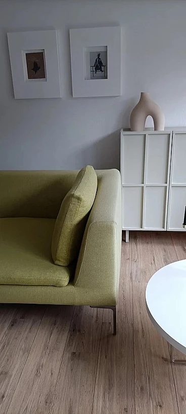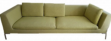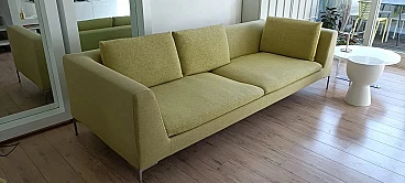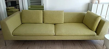 Charles sofa (mod. CHL 270) in apple green fabric by Antonio Citterio for B&B Italia. Purchased in 2012, in good condition. The upholstery is in apple green Sarib Cat Sup fabric in cotton, wool, nylon. Pleasant to the touch. A very beautiful sofa, large, comfortable and deep, still magnificent in any environment. There are no stains in the fabric but due to the sun the right side is a little discolored (see photos). Other than that, the cushions are firm and taut; perhaps the left pillow could be padded a bit. The discoloration is mostly on the right side of the sofa and slightly on the top edges. Seat height: 42 cm.