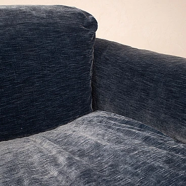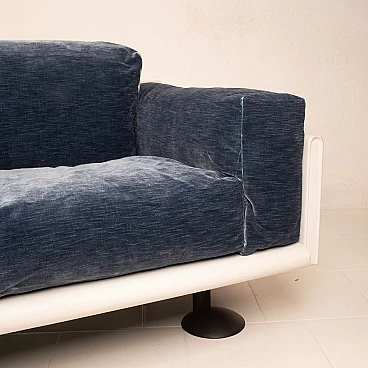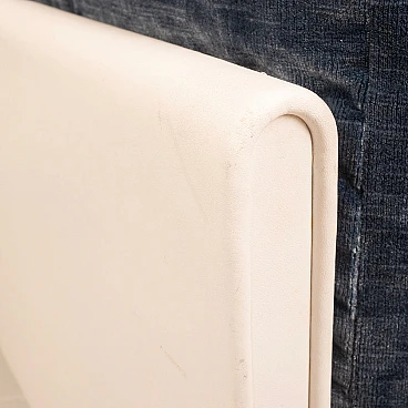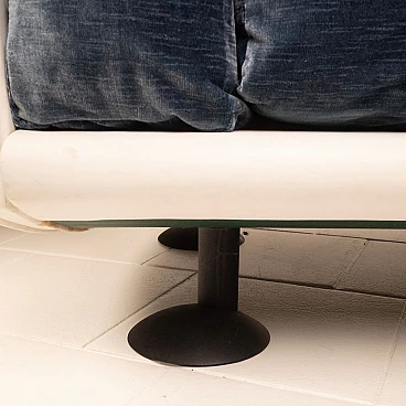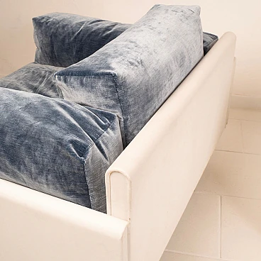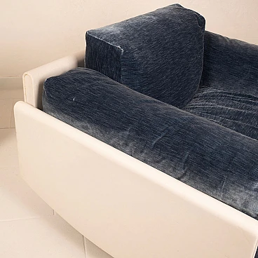 Beautiful and very rare pair of Giulio armchairs designed by Afra and Tobia Scarpa for Meritalia in the 1980s. These incredible armchairs are made of white leather and precious natural blue linen velvet, with goose down cushion interiors and special semi-spherical feet that rotate and can be positioned as desired. The inside of the armchairs is marked with the serial number, 681\682. The condition is almost perfect, the linen velvet is as good as new and the white leather may show some tiny signs of time as shown in the photographs, overall it is in excellent condition. Unique currently on the market and out of production, collector's piece.