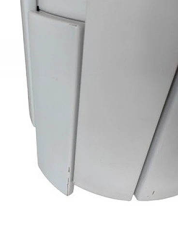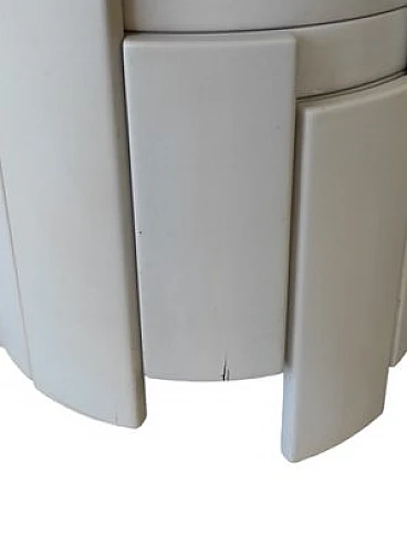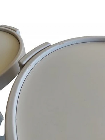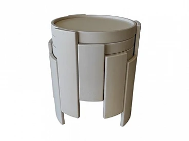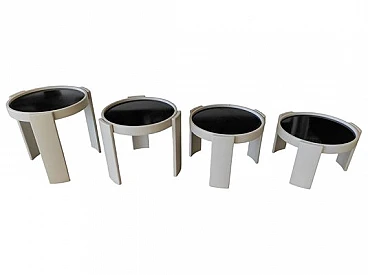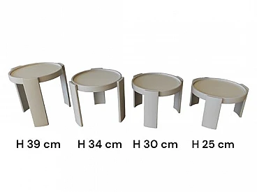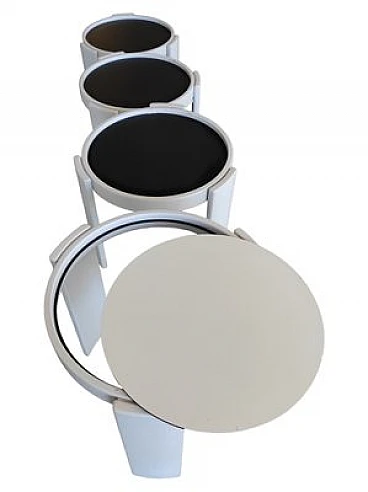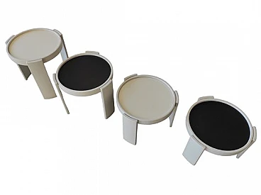 4 Stackable coffee tables mod. 780 in white lacquered beech wood and reversible circular plans in black and white laminate. Excellent conditions, light signs of wear due to time (see photo). Size: Height table stacked 44 cm; Diameter 41 cm.