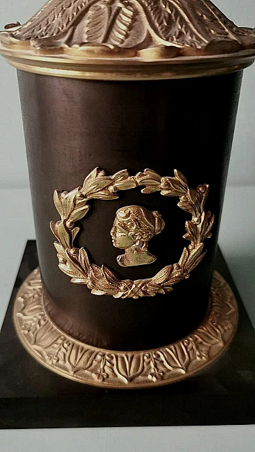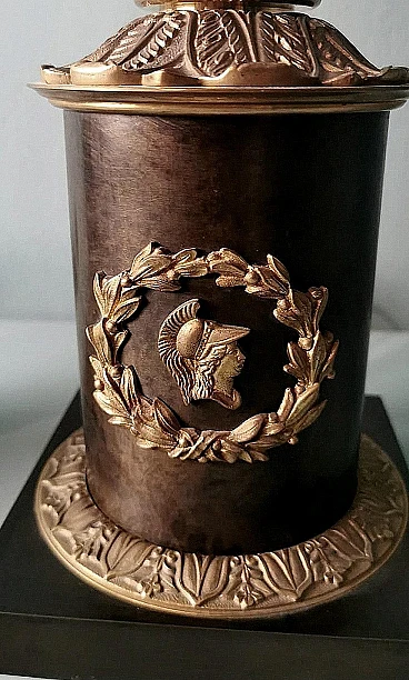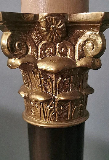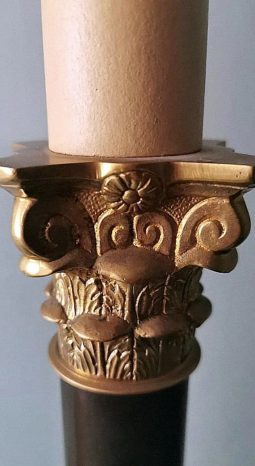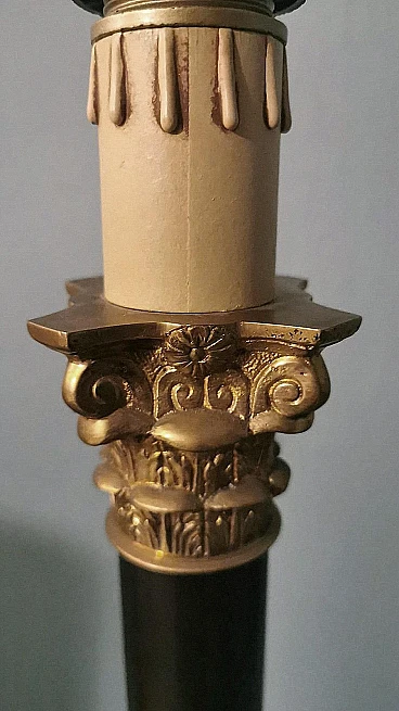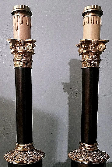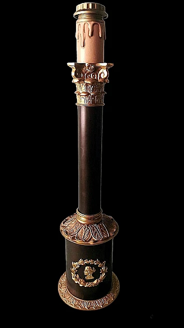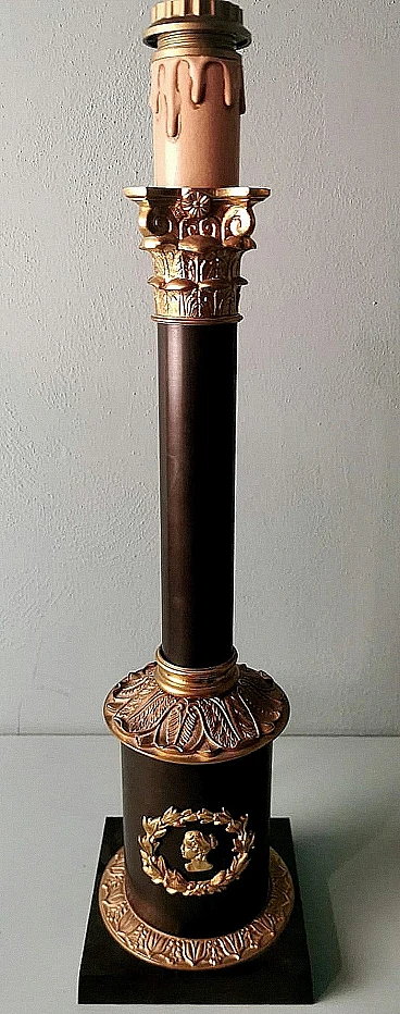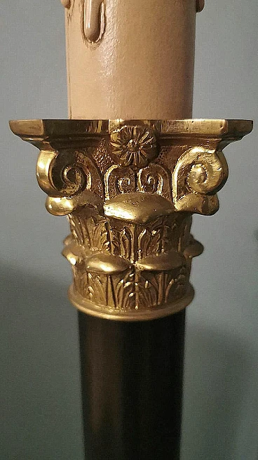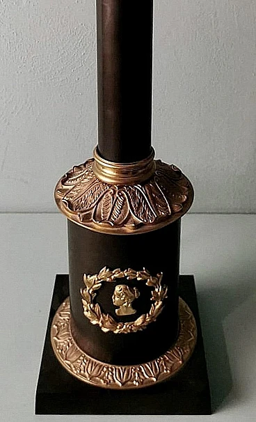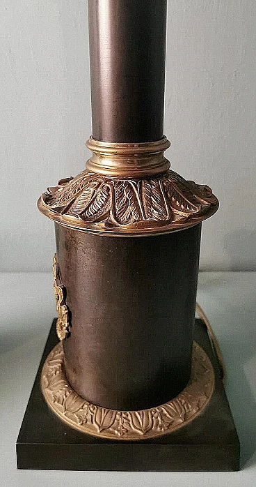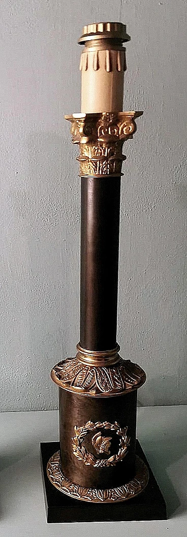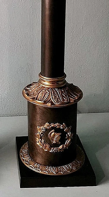 the base and the entire stem are burnished bronze, while the decorations and the massive capital are excellent brass castings; above the capital are placed two faux candles containing the lamp holder. Two distinctive brass decorations have been applied to the cylindrical part of the base of each lamp: one classically depicts the head of a Greek goddess with the characteristic gathered hair,