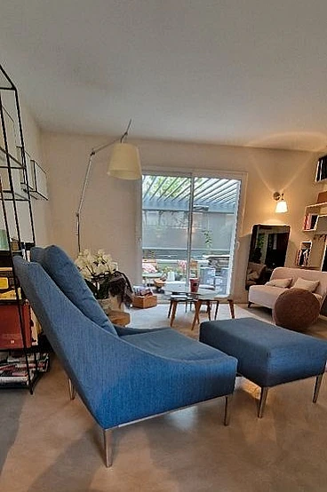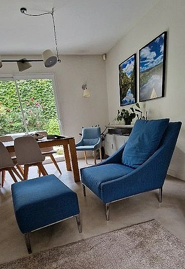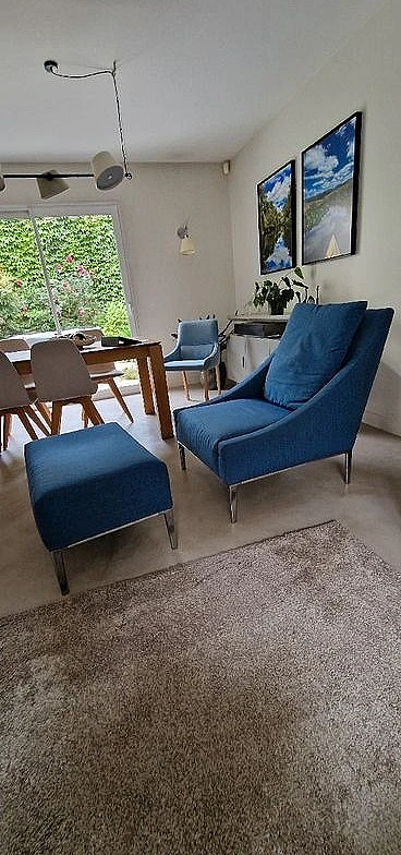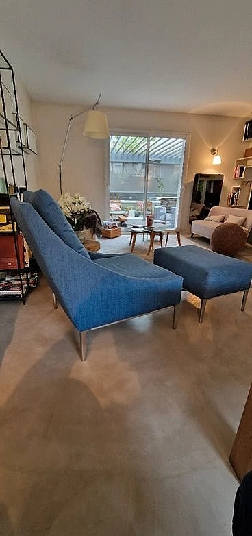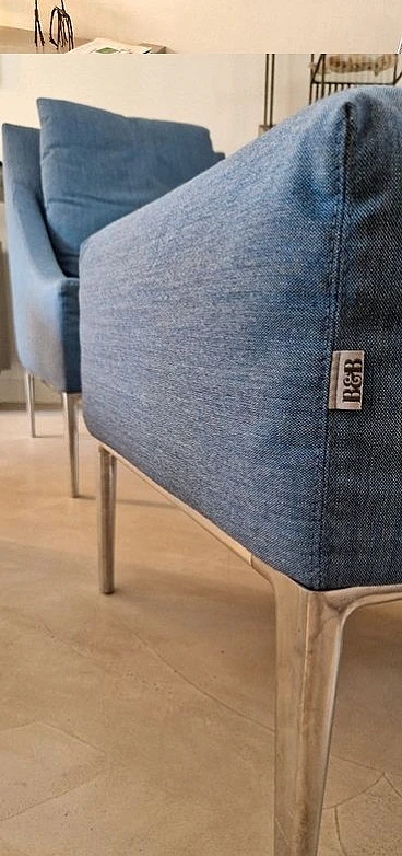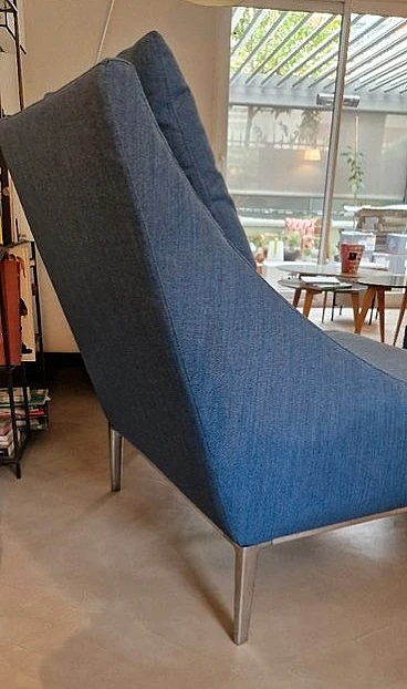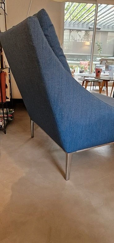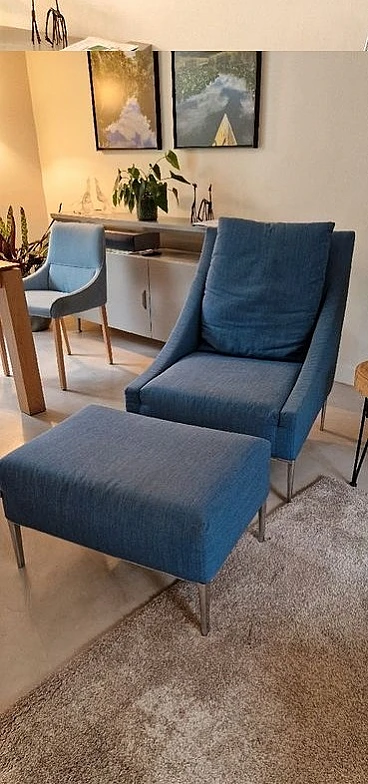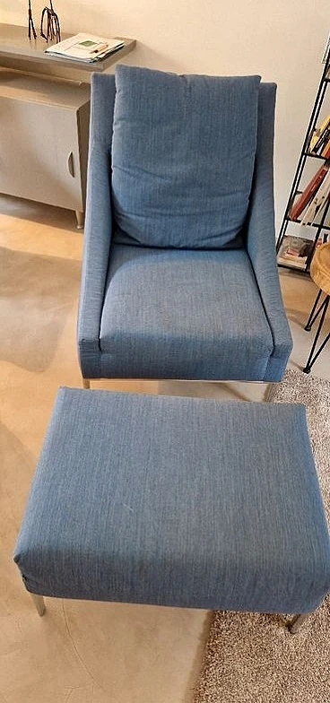 Elegant set consisting of armchair and pouff mod. Jean design by Antonio Citterio. Work by the great Milanese architect in 2013. Excellent condition. Minimal signs of normal home use. Polished steel structure, armchair in completely removable fabric. Armchair complete with pouf. Elegant and refined aesthetic line. Very comfortable seat. Polished aluminum structure, Denim blue cotton covering, design Antonio Citterio. An armchair that does not have a more inclined posture and a different solution for the armrests. Matching footstool pouf. Barium fabric upholstery col. purple and painted aluminum feet. List price of the set €3,850.00. Dimensions: armchair 74 x 97.5 x h 46/96 cm, pouf 74 x 53 x h 46 cm.