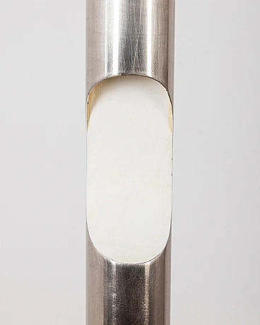 Two-light floor lamp, with chromed metal structure and white glass upper lampshade, second light on the stem, Italian design, 1970s.