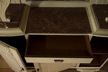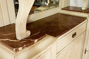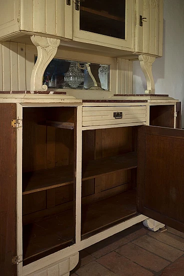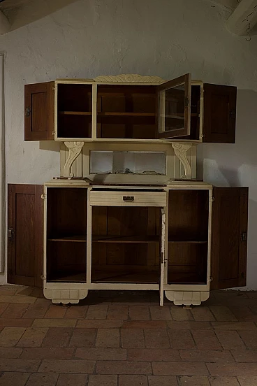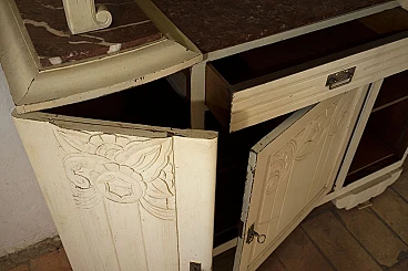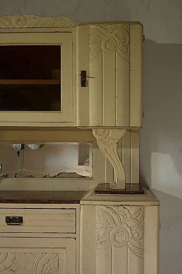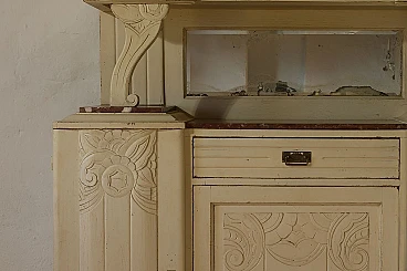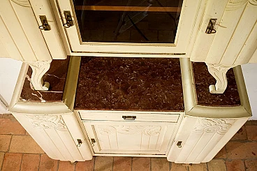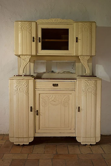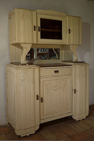Showcase Art Deco dating from the years '20 '30. Made of solid ash wood and embellished by the typical floral carvings that characterize the period. It has two bodies with 6 doors and 1 drawer separated by a living area enriched by an original bevelled mirror period (at some point the silver came off as can be seen from the photos), in the base there are 3 marble slabs that harmonize the figure.