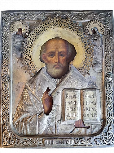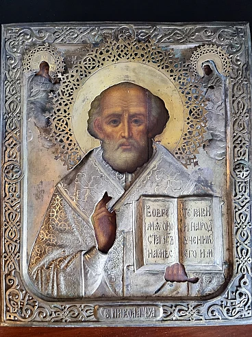 Icon of St. Nicholas with silver-plated and gilded metal riza, 1980s
