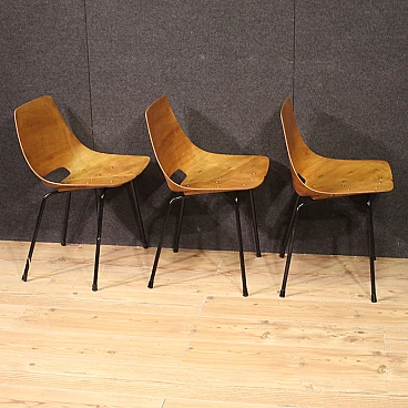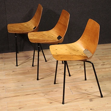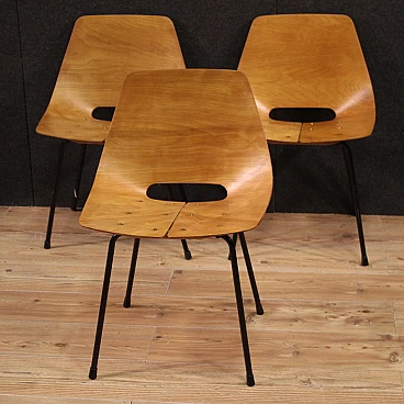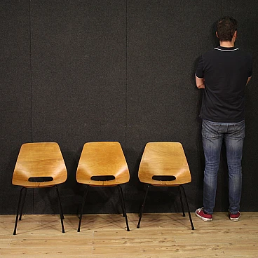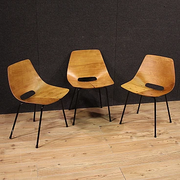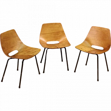 French design chairs of the mid-twentieth century. Lot composed of 3 chairs in thermoformed beech wood and screwed to the base in black lacquered tubular metal. Tonneau chairs by Pierre Guariche (1926-1995) for Steiner Paris, missing additional documentation. Furniture of fabulous line and beautiful decoration, for antique dealers, decorators and collectors of design furniture. Seat of discreet comfort, seat height of 44 cm. They have small signs of the time, structurally healthy, overall in good conservative state.