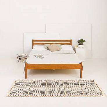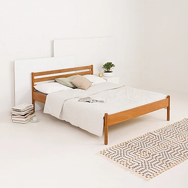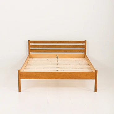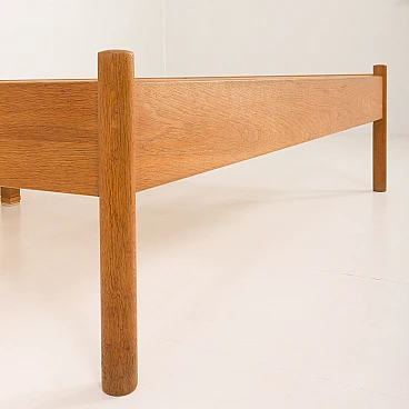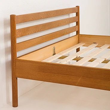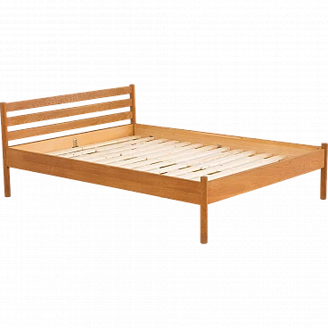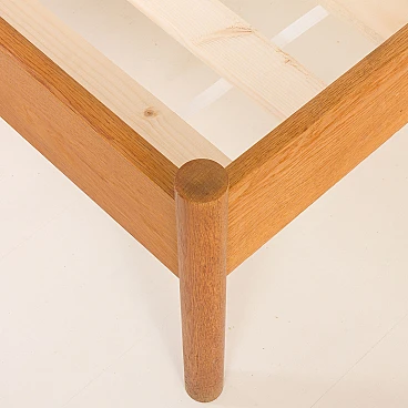 Oak double bed by Hans J. Wegner for Ry Møbler (Denmark), 1970s. It embodies the mix of functionality and aesthetic purity characteristic of modern Scandinavian design. Wegner, a master of Danish modern furniture, is known for his expert craftsmanship and innovative approach to design, which seamlessly blends form and function. The bed is made of solid oak, a material prized for its durability, strength and distinctive grain. The natural charm and sturdiness of oak make it a suitable choice for a piece intended to be beautiful and long-lasting. The use of oak also reflects Wegner's commitment to using high-quality natural materials that age gracefully over time. Clean lines, minimalist look and absence of unnecessary decorations allow the beauty of the wood to take center stage. The bed frame is in perfect original condition with only minimal signs of use consistent with age. Since the mattress base is an essential part of the bed structure, we replaced the old one to ensure maximum stability and provide adequate support, essential for sleeping comfort. Although this is a mid-century piece, Wegner's frame design was carefully crafted for ease of assembly and disassembly. Precise construction and well-fitting components make assembling the bed intuitive and simple. The wooden structure has been cleaned and refreshed with professional compounds to enhance the beauty of the wood, making it a perfect example of comfort and practicality without compromising style. Seat height: 29 cm. The bed does not include a mattress. The recommended dimensions for the mattress are 140 x 190 cm, with a height of no more than 20 cm.