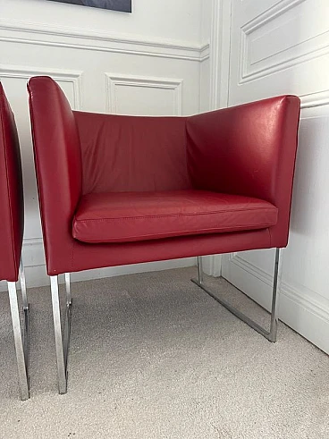 Pair of beautiful Solo armchairs by the great Milanese designer Antonio Citterio, designed in 1999 for the manufacturer B&B Italia, in collaboration with Maxalto. Excellent condition. Minimal marks. The chairs are completely upholstered in thick, soft red Maxalto Alfa leather. Leather with high aesthetic refinement and tactile pleasantness. Hollow brushed polished aluminium frame. The chairs are in excellent condition. Only small superficial signs of normal use on the leather, normal leather creases. Here and there small marks on the base. Negligible. Dimensions: W 65 x D 55 x H 70 cm, seat height 44 cm. Price of the pair 5000 euros.