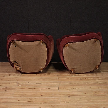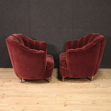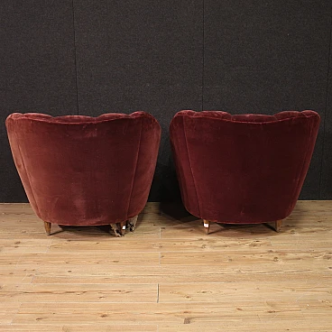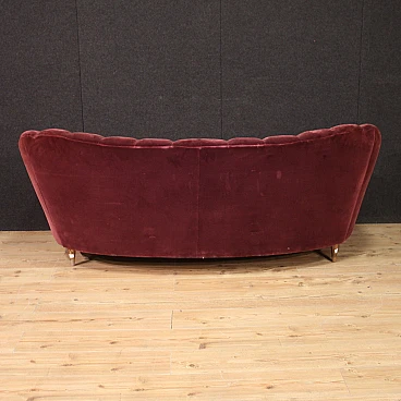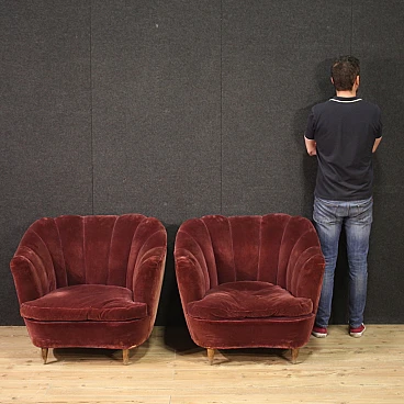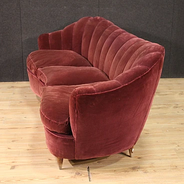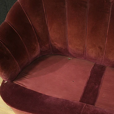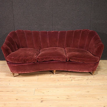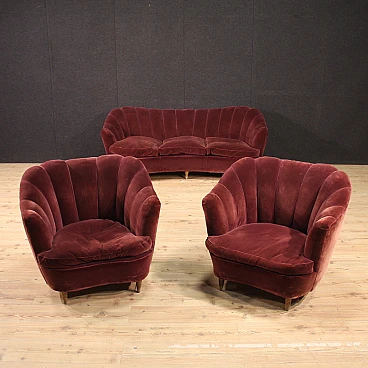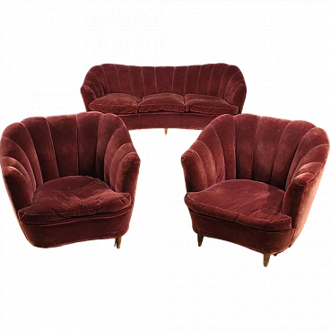 Mid-20th century Italian drawing room. Sofa and two shell-shaped armchairs attributed to Gio Ponti, Casa e Giardino production, of fabulous line and pleasing furnishings. Finished furniture from the centre, upholstered in velvet-effect fabric, supported by solid original wooden feet. Sofa and armchairs of excellent comfort. Hard-to-find furniture, for antique dealers and interior decorators, ideal for inclusion in a large living room. Sofa showing various signs of time and small tears (see photo), structurally sound, to be reupholstered. Measurements sofa H 83 x W 210 x D 90 cm height at seat 45 cm. Measurements armchairs H 82 x W 94 x D 85 cm height at seat 41 cm.