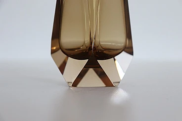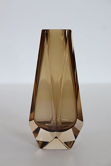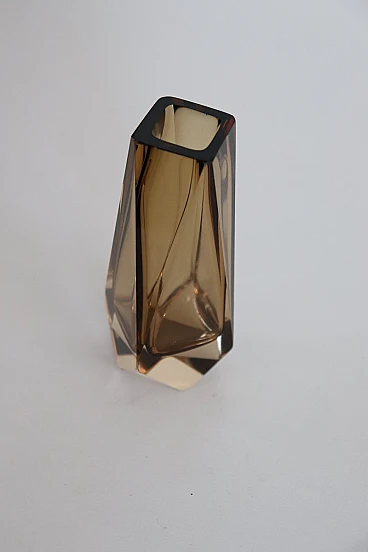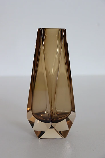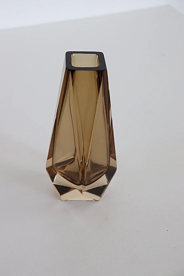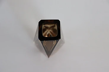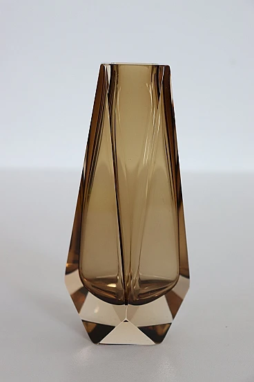Small vase in artistic Murano glass, made in the 60s by the famous designer Mandruzzato, an unparalleled and rare piece, especially thanks to its smoky amber color. Characterized by a considerable thickness of the glass and a unique shape with numerous facets, this vase represents the pinnacle of Murano’s artistic mastery. Mandruzzato is renowned for its production of geometric and cubic glass, and this model perfectly embodies this style. The small size of the vase does not in any way diminish its scenic presence and its elegance, indeed, make the piece even more rare and precious, ideal for any home environment. Despite the absence of trademarks or identifying signatures, attribution to Mandruzzato is supported by the distinctive features of glass and design. This is an opportunity to add a very special element to your collection of artistic glass.