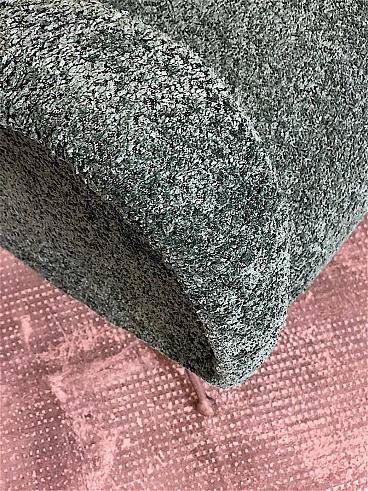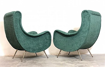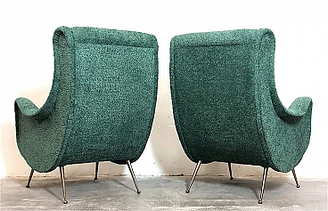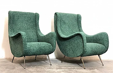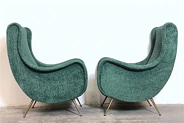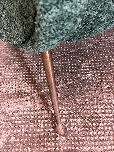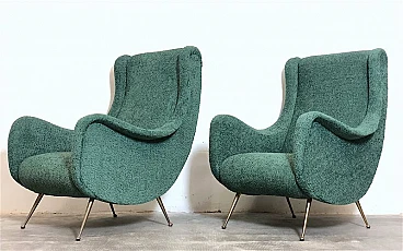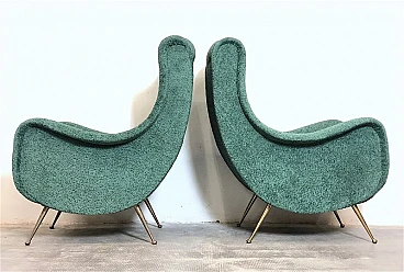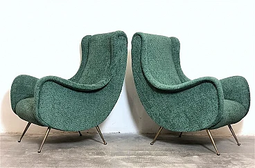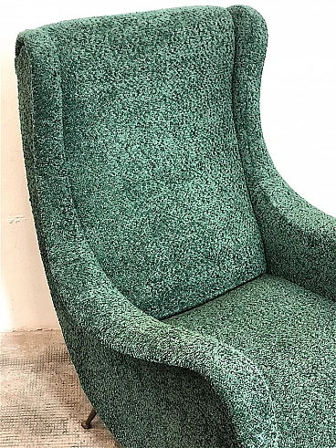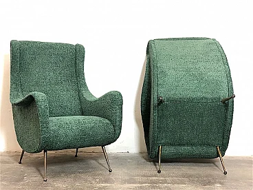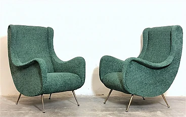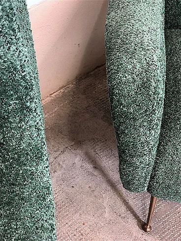 Pair of armchairs by Marco Zanuso, 1960s. A perfect example of craftsmanship and innovation, the armchairs represent a balance between form and function, clean lines and meticulous attention to detail. They are characterized by a solid structure in solid wood, the covering is made of sage green curl fabric, the seat is large and welcoming designed to offer maximum comfort, the feet are in brass with the classic design of the 1960s. Padding for both the seat and backrest have been completely replaced. The armchairs have been completely restored. Seat height: 40 cm. Seat: 50 x 45 cm.