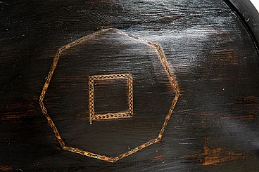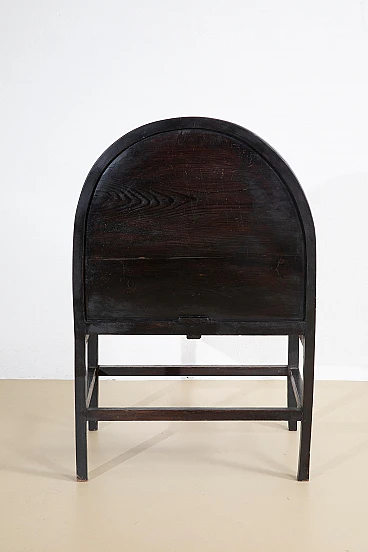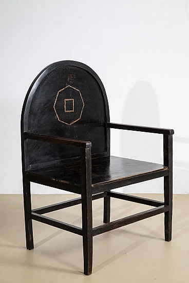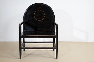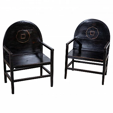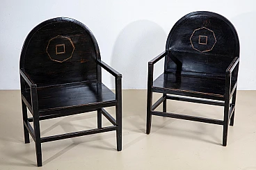 Pair of ebonised larch armchairs with hexagonal carvings, 1920s