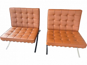 Pair of Barcelona armchairs by Ludwig Mies van der Rohe and Lilly Reich for Knoll International. Very soft hammered leather Volo Cognac. A few months old, perfect condition. Armchair designed by Mies van der Rohe and Reich in 1929 for the German pavilion at the Barcelona International Exposition. This armchair has become an icon of 20th-century design. The model has a slender, curved frame of flat chrome-plated steel with straps supporting cushions upholstered in soft cognac-grained leather; the cushions are quilted in leather with embossed buttons, offering both comfort and style. Its minimalist design, clean lines and balanced proportions make it perfect for any style; a timeless classic that embodies modernist elegance. Excellent condition, minimal signs of use.