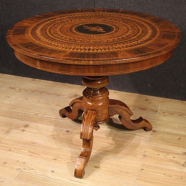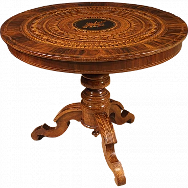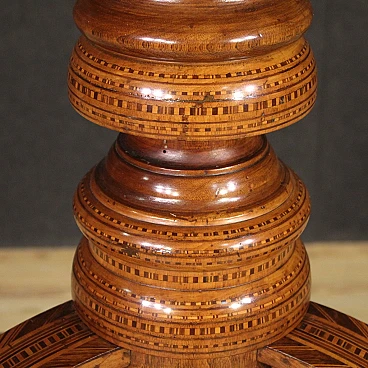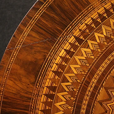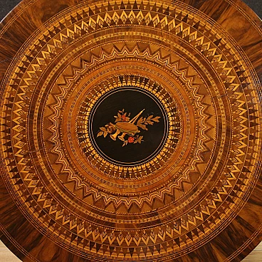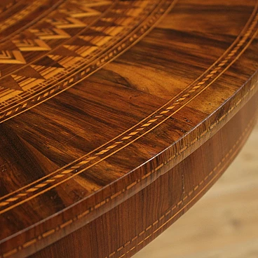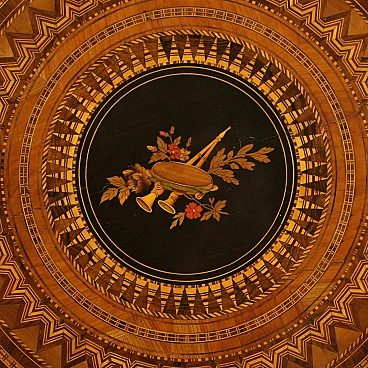 Furniture in walnut, mahogany, maple, bois de rose and fruit wood, finely inlaid with geometric patterns as per the Sorrento tradition. Nicely sized top richly inlaid with central decoration depicting musical instruments and floral motifs (see photo). Solid central leg turned