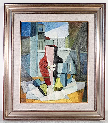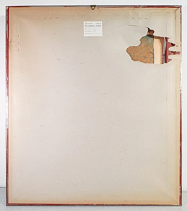 Oil painting on masonite "Composition" by Eros Bonamini, 1974. Signed. Eros Bonamini (1942-2016) was an Italian artist known for his conceptual approach to art, focusing on time and matter. He began his career in the 60s and 70s, exploring minimalism and arte povera. Bonamini has exhibited his works in numerous personal and collective exhibitions in Italy and abroad. His artistic research has evolved through various techniques and materials, including paper, glass and metal, always with the aim of investigating temporal perception and memory. He has collaborated with various galleries and institutions, leaving a significant mark on the contemporary art scene. Measurements without frame: 58.5 x 48.5 cm. Perfect conditions; evaluate through the attached photos.
