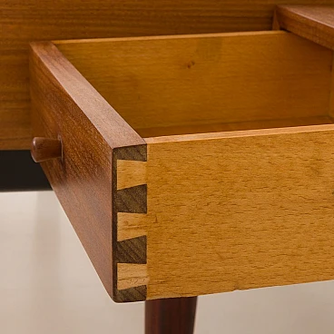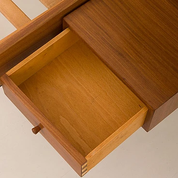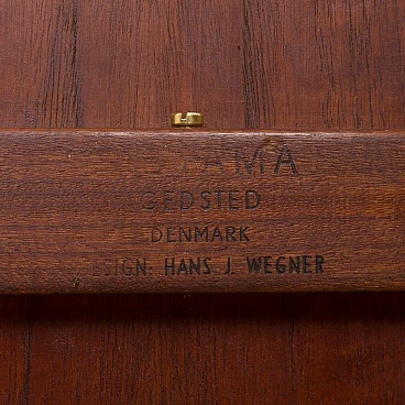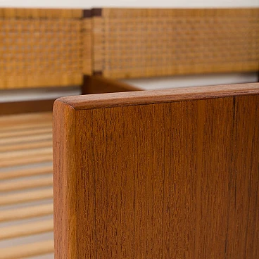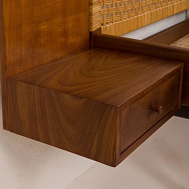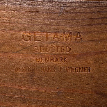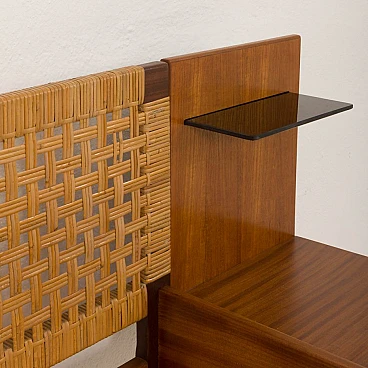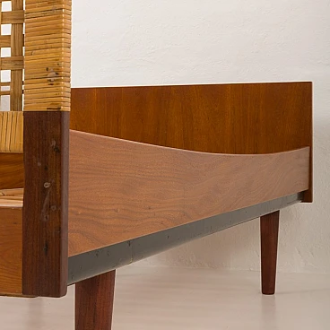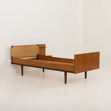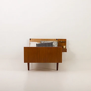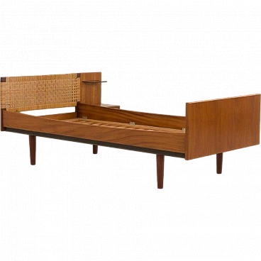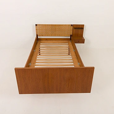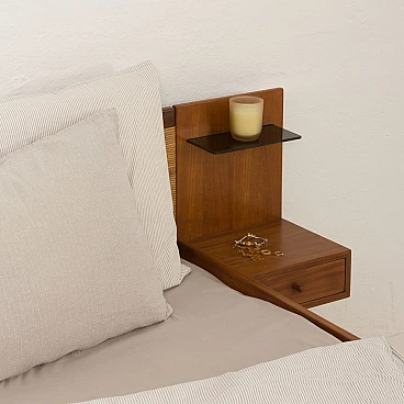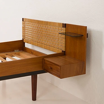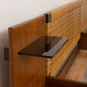 This Hans J. Wegner bed, crafted in the 1960s for Getama, exemplifies mid-century modern elegance. The bed frame is made of rich teak wood, showcasing Wegner’s signature clean lines and impeccable craftsmanship. The headboard features an intricately woven cane panel, adding texture and a touch of natural warmth. The combination of teak and cane highlights Wegner’s skill in merging organic materials with functional design. The bed features a floating night table seamlessly integrated into the frame, enhancing its modern aesthetic and maximizing floor space. The night table is equipped with a single drawer for convenient storage and is complemented by a sleek black glass shelf. The bed is in great original vintage condition. The wooden frame has been cleaned and refreshed with professional compounds to enhance the beauty of the wood, making it a perfect example of comfort and practicality without compromising on style. On the back of the bed and the nightstand, the manufacturer’s engraving is preserved, confirming the authenticity of the origin. Beautifully preserved mid-century gem. The bed does not come with a mattress. The recommended mattress dimensions are 90 cm by 190 cm, with a height not less than 15 cm for proper comfort.