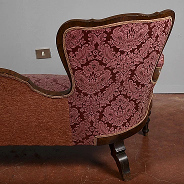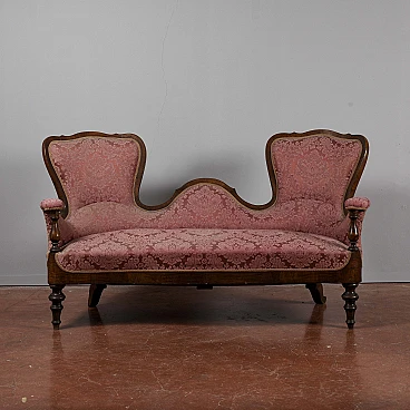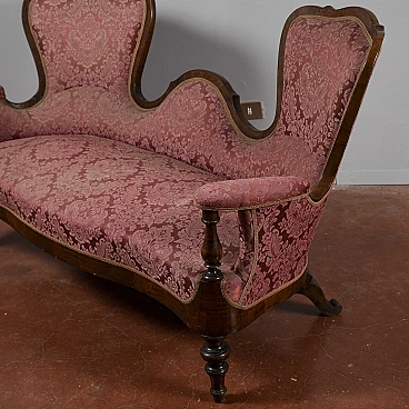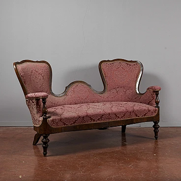 Conversation sofa in walnut and burgundy damask fabric, 19th century