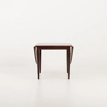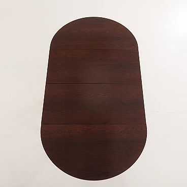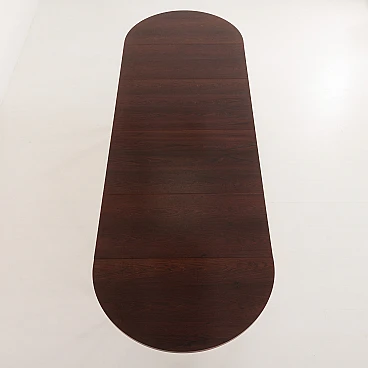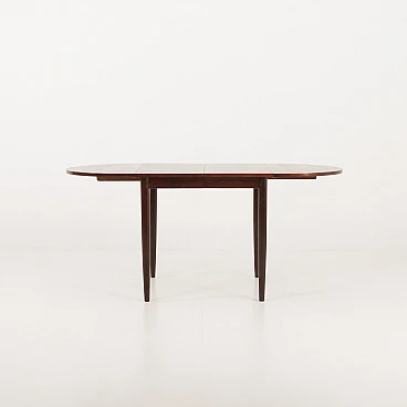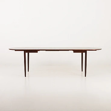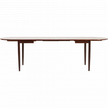 This classic Danish mid-century rosewood dining table is a perfect blend of style and functionality. It features two additional inner extensions leaves, each 43 cm wide, allowing you to extend the table to impressive 253 cm, this one can accommodate even up to 10 guests. The table has beautiful finish, and is crafted from rosewood veneer with solid wood details.
