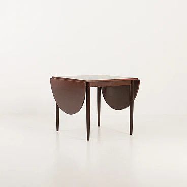 The table is suitable for smaller apartments, while the extensions provide ample space, extending the total width to 179 cm, or 253 cm, also variations between these lengths. The table has been completely refinished with new lacquer, and the runners work smoothly.