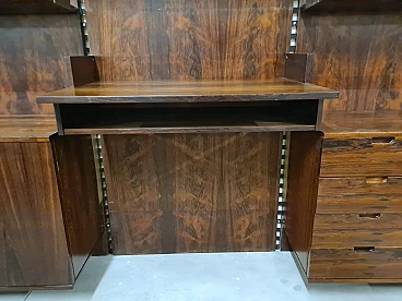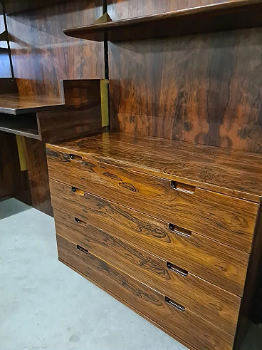 Made up of several interchangeable pieces of furniture, the bookcase is made up of three wall walls, joined and fixed by means of 5 black painted iron tracks, and 9 modules of which 6 shelves with brass supports for anchoring to the wall, 1 chest of drawers, 1 piece of furniture with doors and a surface that can serve as a desk.
