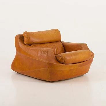 This lounge chair is emblematic of sleek, modernist aesthetics, with its unusual shape, organic curves, and lines that perfectly align with space-age design principles. The armchair features a metal frame that provides both strength and the ability to create its distinctive shape. The frame is covered with stitched, high-quality aniline leather pieces, which add a varied, patchwork style to the chair. The lines and stitching in the design make it truly one of a kind.