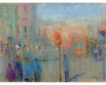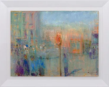 AL SEMAFORO di Renato Criscuolo. Il tema urbano è da sempre fonte di ispirazione per Renato Criscuolo, grande osservatore della vita quotidiana e degli spazi che ci circondano. "Al semaforo" è una cruda, ma allo stesso tempo profondamente intima, rappresentazione del caos quotidiano di una grande città come Napoli e il traffico che caratterizza una metropoli. Con un sapiente uso del colore e pennellate decise, Criscuolo dà un senso di movimento ai soggetti ritratti, incuranti di tutto ciò che li circonda e attenti solo a raggiungere quanto prima la propria meta. I colori sono intensi, con una predilezione per il pastello, vengono messi in modo vigoroso sulla tela, donando tridimensionalità e vita al dipinto. La pittura di Renato Criscuolo, artista partenopeo ed indiscusso maestro di arte contemporanea, è idea, sensazione, sentimento. Criscuolo modella il colore ed al contempo modella la nostra emozione attraverso il gioco poliedrico dei sensi creando intermediazioni che muovono dalla percezione visiva per sconfinare poi in altri ambiti sensoriali solo all’apparenza meno tangibili eppure avvincenti e rapinosi. Dinanzi ad un quadro di Criscuolo il nostro guardare si amplifica fino ad avvertire profumi, suoni, silenzi, gusti, smarrimenti dell’anima, moti gioiosi, intermittenze emotive, nostalgiche e talvolta indomabili, che rivelano l’intimità sovrana del pittore e la padronanza viscerale della tela. Il dipinto misura cm. 60 x 80