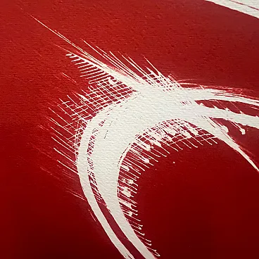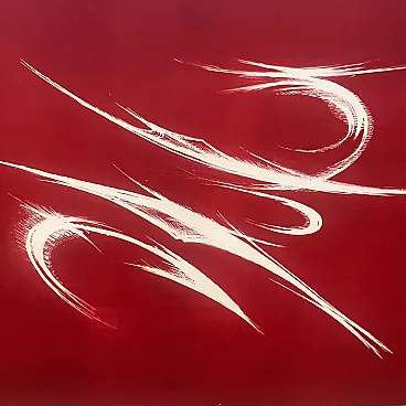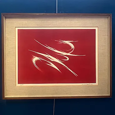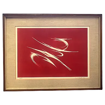 Questa raffinata serigrafia monocroma, realizzata nel 1963 da Carmelo Cappello, è un esempio rappresentativo della ricerca astratta dell’artista. Il fondo rosso intenso, attraversato da gesti grafici bianchi e dinamici, rivela un’energia gestuale che fonde ritmo e equilibrio. L’opera fa parte di una tiratura limitata di 30 esemplari, di cui questa è la numero 26. L’uso del segno come elemento plastico si riflette nella poetica scultorea di Cappello, che anche su carta riesce a trasmettere una straordinaria tridimensionalità visiva. Firmata a mano dall’artista e datata in basso a destra