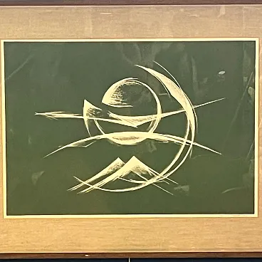 Questa raffinata serigrafia monocroma, realizzata nel 1964 da Carmelo Cappello, è un esempio rappresentativo della ricerca astratta dell’artista. Il fondo verde acqua, attraversato da gesti grafici bianchi e dinamici, rivela un’energia gestuale che fonde ritmo e equilibrio. L’opera fa parte di una tiratura limitata di 40 esemplari, di cui questa è la numero 15. L’uso del segno come elemento plastico si riflette nella poetica scultorea di Cappello, che anche su carta riesce a trasmettere una straordinaria tridimensionalità visiva. Firmata a mano dall’artista e datata in basso a destra