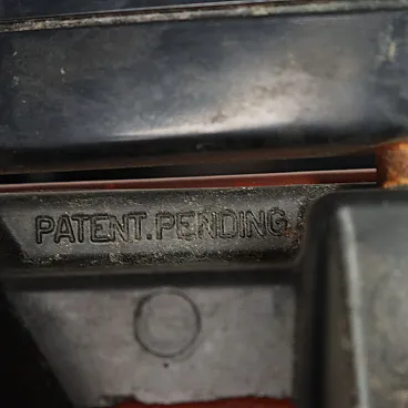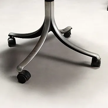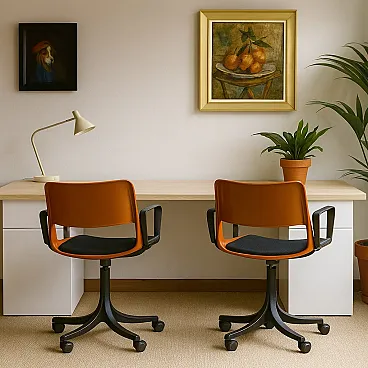 Coppia di sedie da ufficio con scocca in materiale plastico arancione, seduta e schienale con imbottitura in espanso e rivestimento in tessuto nero, gambe in metallo a quattro razze con rotelle. Presente il marchio della manifattura.