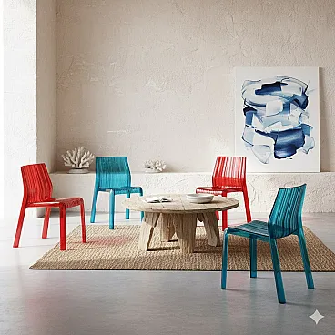 Set di sedie in plastica trasparente, due nei toni del rosso e due nei toni del blu.