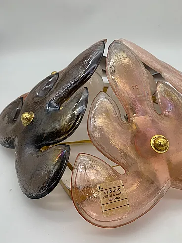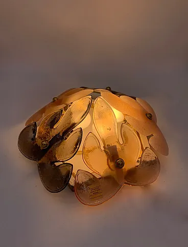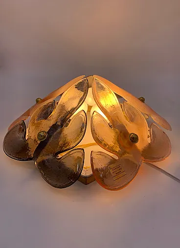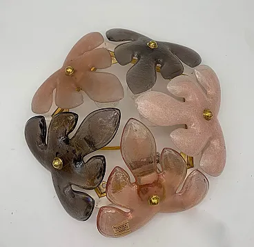 Corpo illuminante da soffitto, caratterizzato da una struttura circolare in metallo dorato su cui sono montati diversi elementi decorativi in vetro colorato a forma di foglie stilizzate. Le foglie, spesse e leggermente bombate, sono disposte in modo regolare e armonioso intorno al centro, fissate da piccole viti dorate che ne evidenziano la cura artigianale. I vetri presentano tonalità delicate e sofisticate — rosa cipria, grigio fumé e trasparente ambrato — che si alternano creando un effetto cromatico morbido e bilanciato. Le superfici sono lucide ma con una leggera texture interna che diffonde la luce in modo caldo e avvolgente. La struttura interna in ottone, solo parzialmente visibile, dona un accento prezioso e retrò al design complessivo. Sul vetro frontale è applicata un’etichetta con la scritta “Seguso Vetri d’Arte – Murano – Made in Italy”, che ne attesta la manifattura di alta qualità tipica della tradizione muranese, conferendo al pezzo un valore artistico e collezionistico.