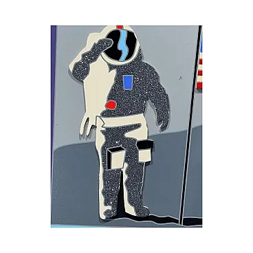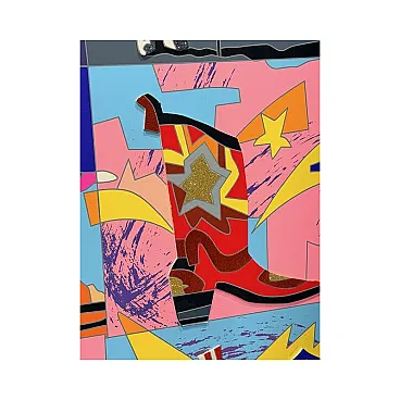 Ugo Nespolo, "AMERICAN ICONS" serigrafia polimaterica a 46 colori su cartoncino con interventi in collage, glitter, floccaggi, foglia oro e carborundum. Edizione limitata in 50 esemplari anno 2016. Formato del foglio cm 70 x 140. Esemplare n° 44/50 Opera corredata da certificato di autenticità.