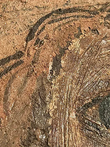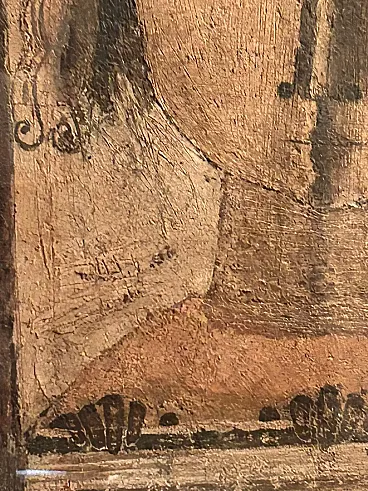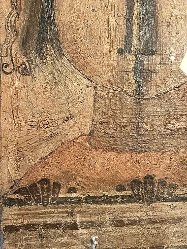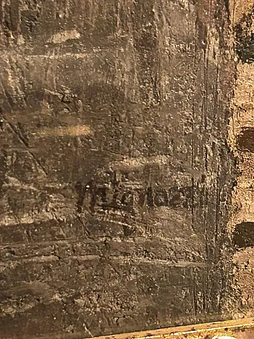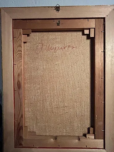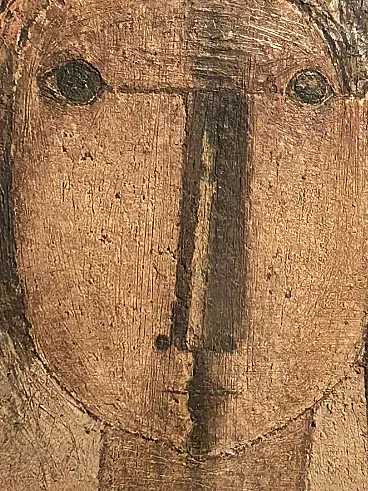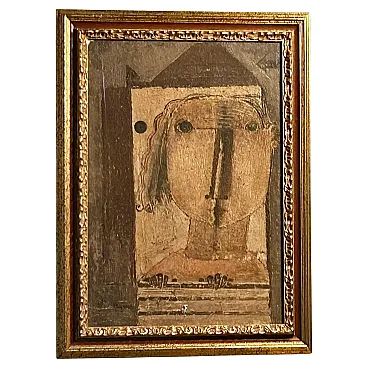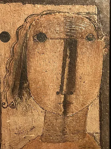 Opera dell'artista italiano Antonio Mignozzi, realizzata su tela preparata in stile affresco e incorniciata, dimensioni della tela 35 × 50 cm (incorniciata 44.5x59). L'opera mostra la cifra stilistica di Mignozzi, con una composizione essenziale, tratti segnici e atmosfera sospesa, che rimanda alla sua poetica della materia, della tela come intonaco e del segno come graffiti antichi. Il lavoro è firmato in basso (e reca firma al retro) e proviene da collezione privata. In perfette condizioni strutturali, l'incorniciatura originale valorizza tutta la sensibilità estetica dell'artista. Si trova conferma che Mignozzi utilizza "tele di sacco preparate ad affresco" come supporto, che "si offrono come frammenti di muro staccato, di intonaco prelevato dai recessi di una memoria culturale". L'opera sfoggia una superficie che ricorda questo effetto materico (vedi graffi, tracce, struttura quasi "ruvida"), quindi coerente con la tecnica dichiarata dell'artista. Nell'opera, il soggetto è una figura frontale, essenziale, col volto stilizzato, con un gioco di semplificazione dei contorni e dei volumi. Le fonti dicono che Mignozzi "col trascorrere degli anni ... tende sempre di più all'essenzialità, a un discorso meditato ... dove si esalta l'escavazione calligrafica e l'equilibrio compositivo". Antonio Mignozzi nasce nel 1942 a Trebisacce (CS), ha studiato all'Accademia di Brera a Milano, vive e lavora a Verbania dal 1973. La sua pratica pittorica indaga la memoria visiva, la materia e la sospensione del tempo tra figurazione e astrazione. Le sue opere sono state presentate in numerose mostre personali a Milano, Brescia, Locarno e Verbania, e sono presenti nei cataloghi specializzati d'asta. Il mercato attuale dell'artista segnala passaggi che si collocano in fasce modeste, rendendo quest'opera un'opportunità interessante per collezionisti di ricerca o per ambienti di design contemporaneo. Mostre personali: 1967 Galleria La Chioccia, Bari 1969 Galleria Il Portichetto, Rho 1970 Galleria Il Triangolo, Busto Arsizio … 1979 Galleria Labus, Brescia, Galleria Palmieri, Milano 1981 Studio d'Arte Verbano, Locarno CH 1988 Studio d'Arte Lanza, Verbania - Intra L'artista "partecipa a molte Collette pubbliche, vincendo diversi premi".