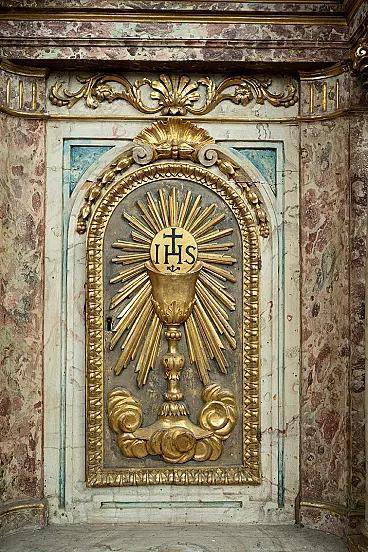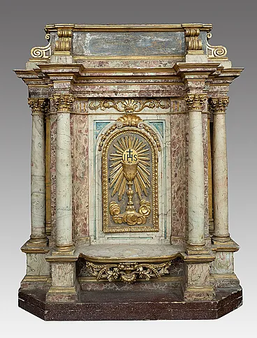 Descrizione: Antico tabernacolo in legno marmorizzato di provenienza romana appartenente alla seconda metà del XVII secolo. Il prospetto frontale è caratterizzato da quattro colonne in legno marmorizzato bianco terminanti con capitelli in legno dorato. Nella parte centrale troviamo un'anta raffigurante un calice sormontato dal monogramma "IHS" (dal greco Iesus Hominum Salvador, "Gesù Salvatore degli uomini") circondato da raggi, simbolo dell'Eucaristia e della presenza di Cristo. Sotto la mensola troviamo un grosso intaglio in legno dorato raffigurante spighe con cesto di fiori. Il retro ed il cappello riportano ancora i fondali originali dell'epoca. Provenienza: Roma XVII secolo. Misure: 90x50 H105cm. Condizioni: Buone condizioni. Documento: Certificato di Autenticità. Assistenza: Siamo a vostra disposizione per ulteriori chiarimenti o dettagli fotografici Spedizioni: In tutta Italia, Europa e resto del mondo a prezzi bassissimi con la massima sicurezza e tracciabilità. La spedizione verrà concordata privatamente e non sarà costosa. Ti auguriamo una buona giornata. Antichità Borrelli.