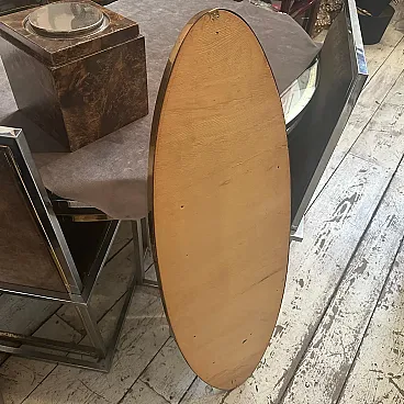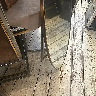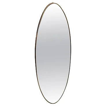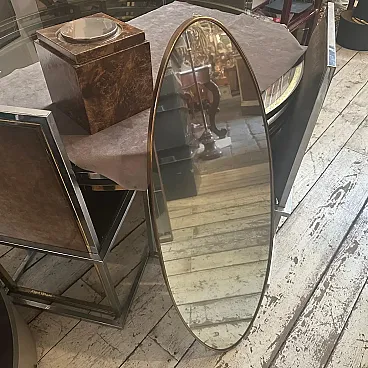 Specchio da parete oblungo in ottone massiccio disegnato e prodotto in Italia negli anni Cinquanta alla maniera di Gio Ponti che utilizzava questi specchi nelle case più importanti di Milano; l'ottone è in patina originale e presenta piccoli segni d'uso e d'età, il vetro dello specchio è quello originale. Gli anni '1950 sono stati un periodo di grande creatività e innovazione nel mondo del design e il movimento Mid-Century Modern è stato all'avanguardia in questo periodo entusiasmante. Questo specchio da parete ovale italiano in ottone massiccio è un esempio straordinario di questo stile di design e un pezzo eccezionale di artigianato italiano. Realizzato in ottone massiccio, questo specchio vanta una finitura calda e dorata, elegante e sofisticata. Il materiale in ottone è molto resistente e malleabile. La forma ovale allungata dello specchio è un motivo classico del design del Mid-Century Modern, che rappresenta il movimento e la fluidità. La forma è perfettamente proporzionata, con una curva dolce che crea un senso di armonia ed equilibrio. Questo specchio è stato progettato per essere appeso alla parete, con una staffa sicura sul retro che ne garantisce il posizionamento. La cornice in ottone dello specchio è semplice, con linee pulite e un design minimalista che permette allo specchio di essere al centro della scena. La cornice è un omaggio ai principi del design di Giò Ponti, una delle figure più importanti e influenti dell'era del Mid-Century Modern. I suoi progetti erano caratterizzati da un'enfasi sulla semplicità e sulla funzionalità. Nel complesso, questo specchio da parete ovale italiano è un pezzo di design mozzafiato che cattura lo spirito e la creatività degli anni Cinquanta. Sarebbe un'aggiunta straordinaria a qualsiasi casa o collezione e sarà sicuramente apprezzata per le generazioni a venire.