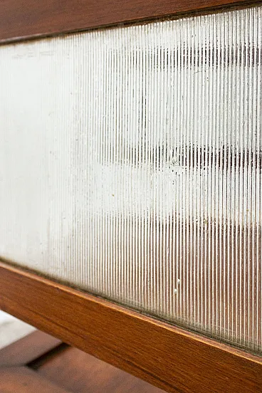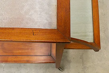 Oltre al piano d'appoggio principale, ve ne sono due laterali richiudibili, tutti in vetro zigrinato. Alla base il piano d'appoggio è in legno. Completano la dotazione quattro rotelle in ottone La linea è molto semplice ed elegante, di grande effetto. Le condizioni sono ottime, considerata l'età. Il carrello è solido, con qualche piccolo segno dovuto all'utilizzo. Uno dei vetri richiudibili ha una piccola scheggiatura, difficile da notarsi (vedi foto)