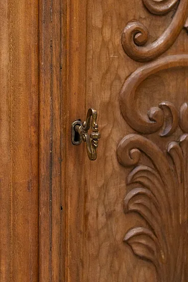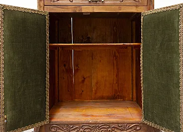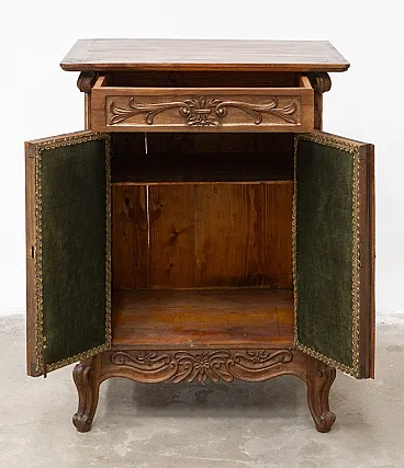 Mobiletto anni '60 a due ante, in legno di abete e noce Le ante il cassetto sono intagliati a mano con motivi floreali. Piedino mosso in stile Luigi XV Il mobiletto è in ottime condizioni, con normali segni d'uso. Lo abbiamo pulito e lucidato a scopo conservativo