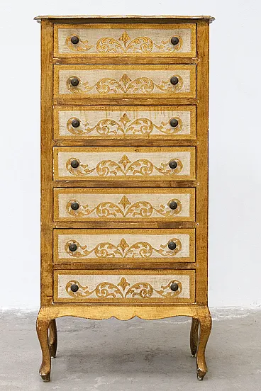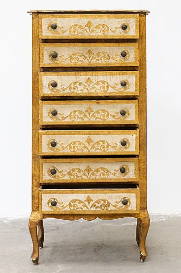 Cassettiera settimanale dorata in stile veneziano, manifattura toscana anni '60 Il Settimino è in buone condizioni generali, con qualche difetto sulla doratura (vedi foto) e l'ultimo cassetto che si apre a fatica perchè un po' incurvato.