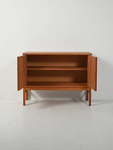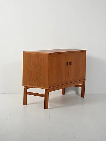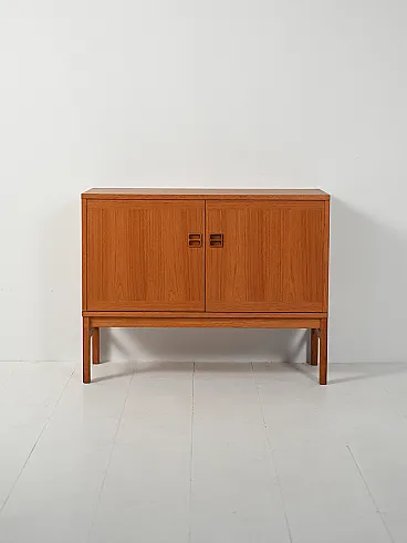 Cabinet in teak con due ante a battente, maniglie intagliate a doppia foratura e linee geometriche che valorizzano la venatura del legno. Elegante cabinet scandinavo in teak, anni ’60, impostato su basi leggere e volumi rigorosi. Le due ante a battente presentano maniglie intagliate a doppia foratura con profilo a sbalzo, dettaglio tipico del razionalismo nordico. Interno con ripiano per organizzare al meglio lo spazio. Finitura calda e costruzione accurata. Buone condizioni. Potrebbe presentare dei segni del tempo. Per piacere presta attenzione alle fotografie.
