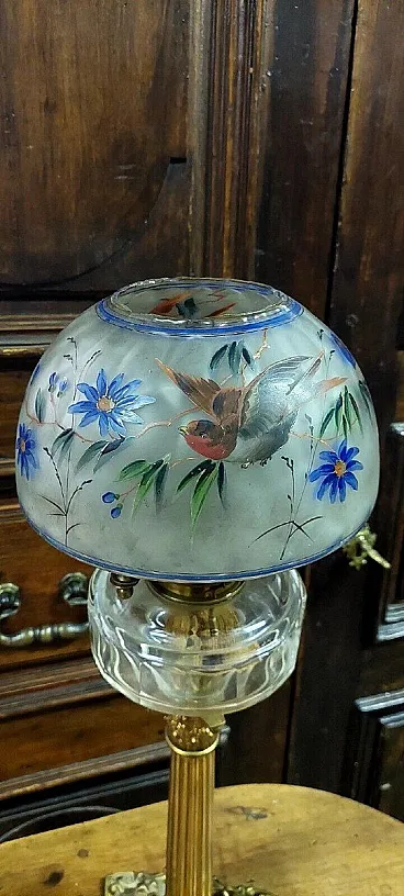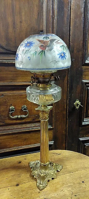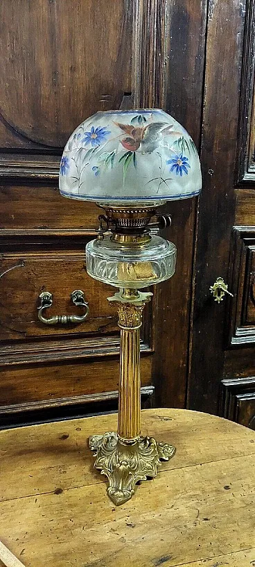 Lampada a olio in bronzo dorato e vetro dipinto, '800