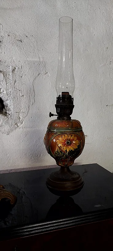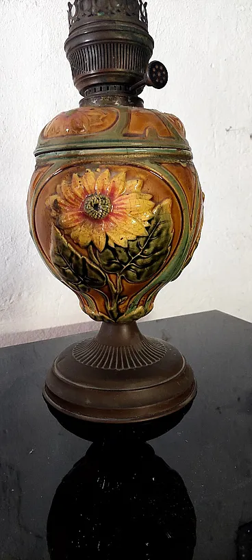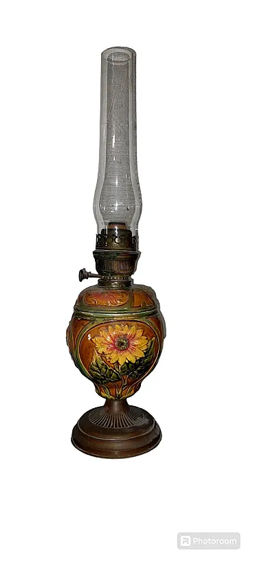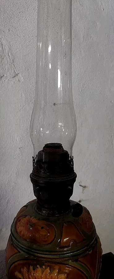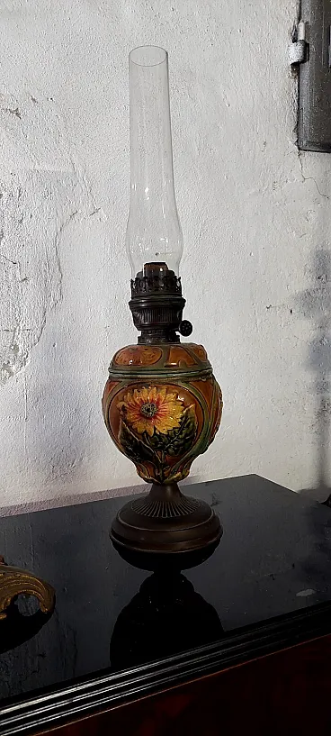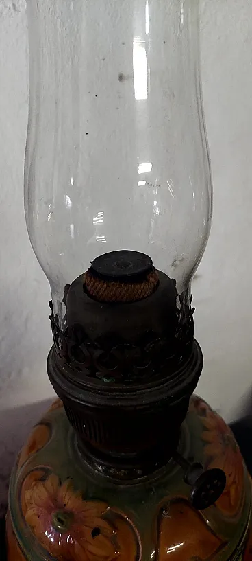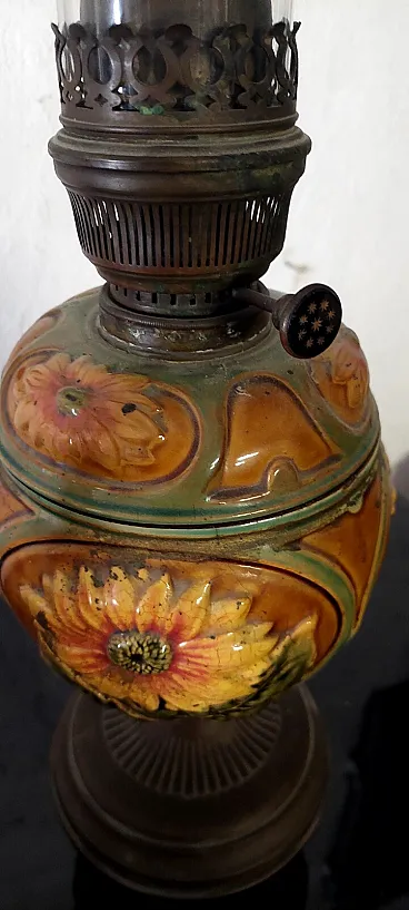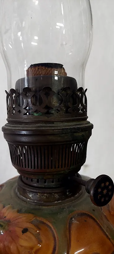 Lampada a petrolio in metallo, ceramica e vetro, inizio '900