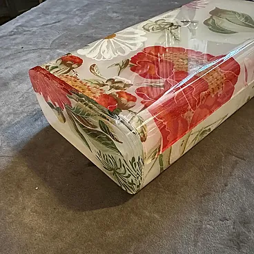 Iconica scatola floreale italiana Mid-Century Modern degli anni '70 di Ulderico Cavinato Questo eccezionale cofanetto vintage è un pezzo definitivo del celebre designer italiano Ulderico Cavinato, noto per il suo uso lussuoso e innovativo dei materiali acrilici. La scatola è realizzata in plexiglass spesso e trasparente (lucite/acrilico), che le conferisce la forma pulita e moderna tipica del periodo del Mid-Century. Ciò che rende questo pezzo davvero notevole è il vibrante e sofisticato disegno floreale permanentemente racchiuso nel materiale. Grandi fiori colorati nei toni del rosso, del rosa e del bianco, su uno sfondo chiaro, danno l'illusione di fiori sospesi nel ghiaccio. Questa decorazione interna è una tecnica iconica utilizzata da Cavinato, che crea un oggetto da collezione che funge sia da mobile funzionale che da opera d'arte. Il coperchio è incernierato per facilitare l'accesso e rivela un interno che, in alcune versioni, include divisori trasparenti. Questo elegante contenitore è perfetto per essere utilizzato come portagioie di alto stile, accessorio da scrivania o da tavolo, offrendo un fantastico mix di glamour italiano anni '70 e design postmoderno. Non è mai stato usato, proviene da un negozio che ha cessato l'attività.