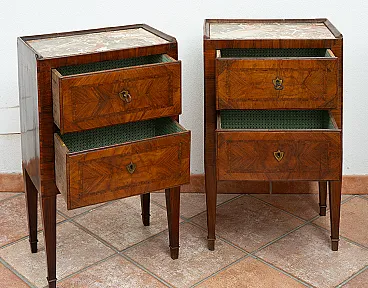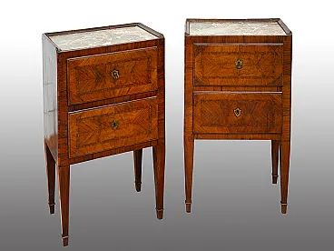 Descrizione: Coppia di comodini antichi Luigi XVI Napoletani in radica di noce con riserve in bois de rose appartenente alla seconda metà del XVIII secolo.