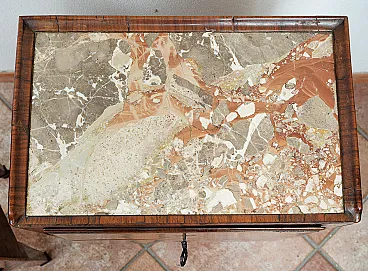 I due piedi hanno il classico andamento a troncopiramidale tipico dello stile di appartenenza mentre il piano è in breccia coeva allo stesso.